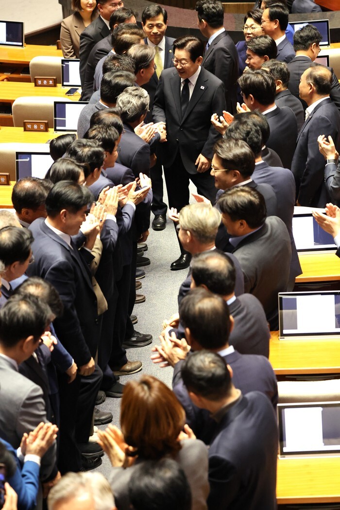 President Lee Jae Myung (C, top) is applauded by lawmakers of the ruling Democratic Party as he exits a plenary session of the National Assembly in Seoul on Nov. 4, 2025, after delivering the 2026 budget speech. (Pool photo) (Yonhap)