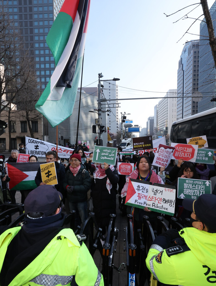 Islamic followers and supporters of the Palestinian cause stage a rally in front of the Israeli Embassy in Seoul on Jan. 17, 2025, to call on Jerusalem to immediately approve a cease-fire deal with the Palestinian militant group Hamas. (Yonhap)