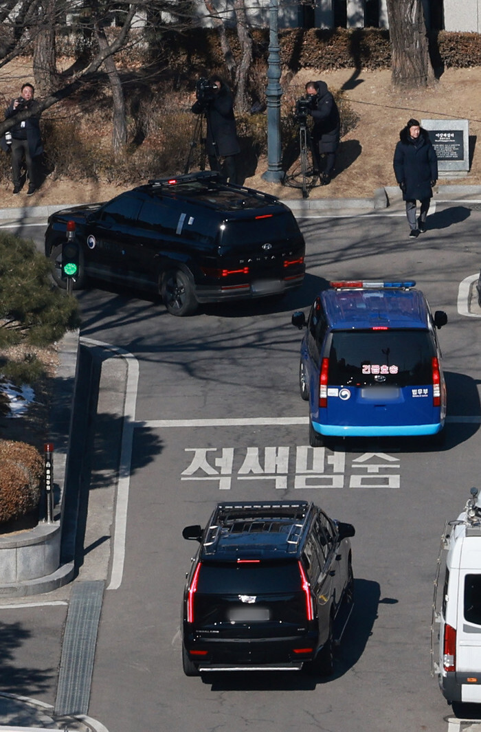 A justice ministry vehicle (C, blue) carrying arrested President Yoon Suk Yeol enters the Constitutional Court's grounds in Seoul on Feb. 4, 2025, as Yoon will attend the fifth hearing of his impeachment trial in connection to his short-lived imposition of martial law in December. (Yonhap)
