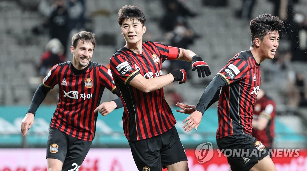 | ▲ Ki Sung-yueng of FC Seoul (C) celebrates his goal against Gwangju FC during the teams' K League 1 match at Seoul World Cup Stadium in Seoul on March 17, 2021. (Yonhap) |