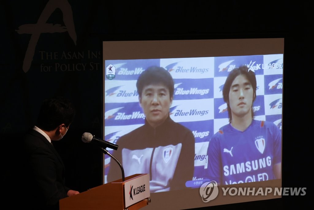 | ▲ Suwon Samsung Bluewings head coach Park Kun-ha (L) and defender Kim Tae-hwan attend a press conference in Seoul on March 18, 2021, ahead of the "Super Match" derby against FC Seoul in the K League 1. (Yonhap) |