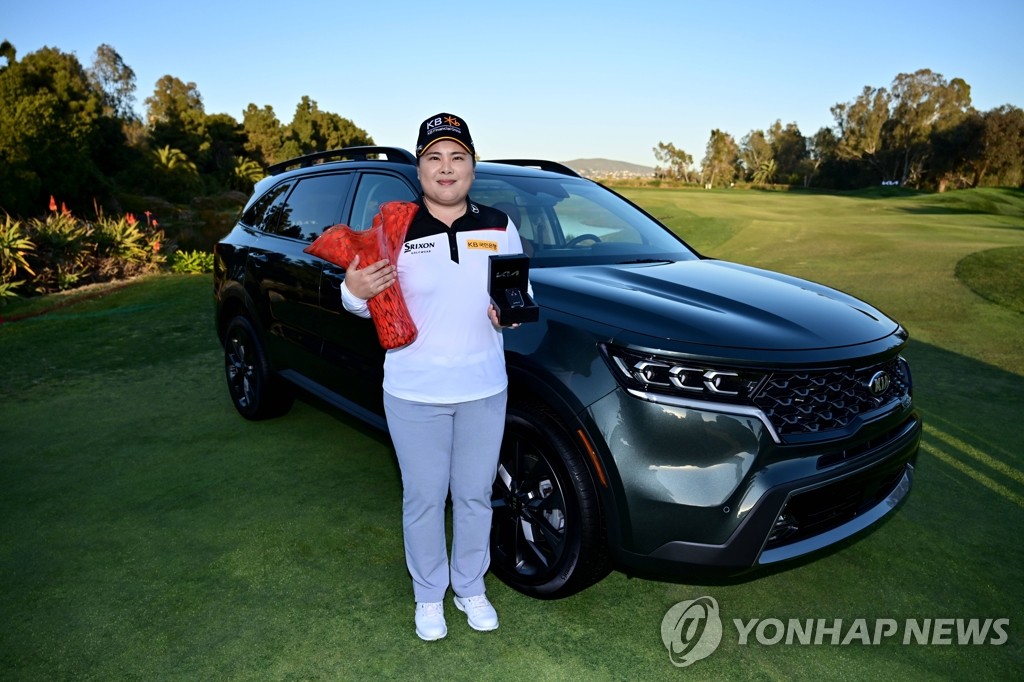 | ▲ LPGA KIA 클래식 우승해 트로피 든 박인비 (칼즈배드 AFP/게티이미지=연합뉴스) 28일(현지시간) 미국 캘리포니아주 칼즈배드 아비아라 골프클럽에서 열린 미국여자프로골프(LPGA) 투어 KIA 클래식에서 우승한 박인비(33)가 쏘렌토 SUV 차량 앞에서 트로피를 들고 있다. 그는 최종합계 14언더파 274타를 기록, 공동 2위 에이미 올슨과 렉시 톰프슨(이상 미국·9언더파 279타)을 5타 차로 따돌리고 정상에 올라 LPGA 개인 통산 21번째 우승을 챙겼다. 우승 상금은 27만 달러(약 3억550만 원)다. knhknh@yna.co.kr |