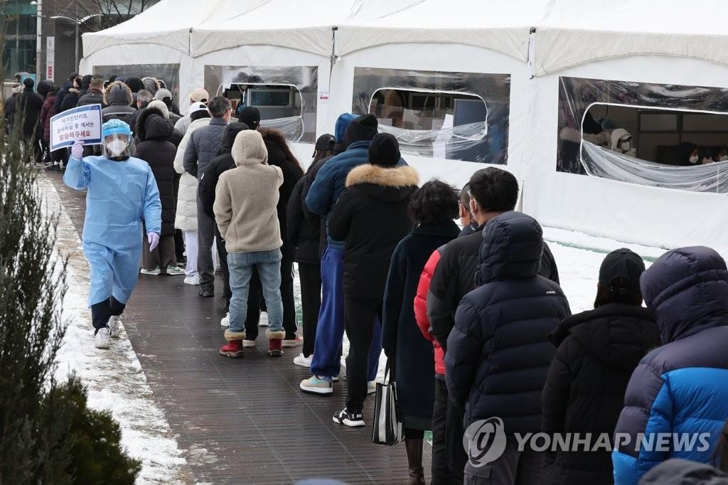 | ▲ This photo taken on Feb. 1, 2022 shows people in line to take a coronavirus test at a makeshift testing center in Songpa, eastern Seoul. (Yonhap) |