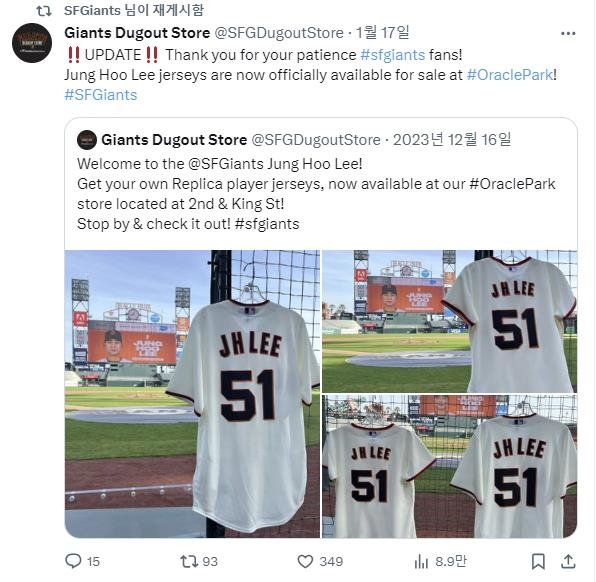 샌프란시스코 공식 상품 몰은 "그동안 인내심을 보여주신 팬들께 감사하다"라며 "이제 이정후의 유니폼을 (홈구장) 오라클파크에서 구매할 수 있다"고 전했다.