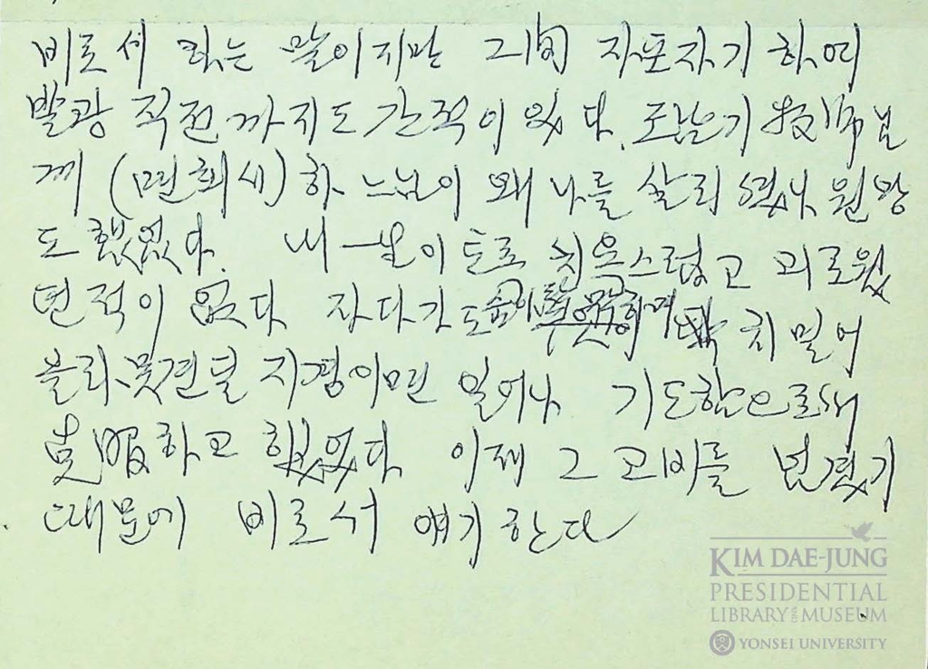 (서울=연합뉴스) 오보람 기자 = 연세대학교 김대중도서관은 이른바 내란음모 조작사건으로 수감돼 고초를 겪었던 김대중 전 대통령의 당시 심경을 담은 메모를 17일 공개했다.