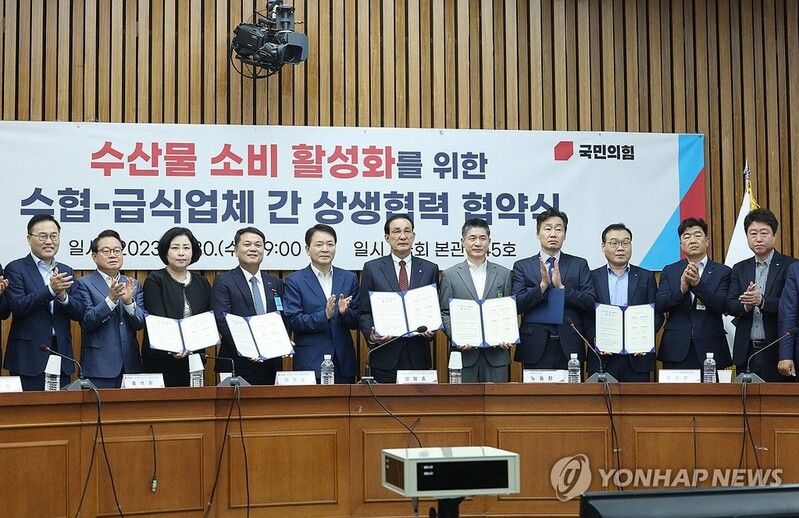 | ▲ Lawmakers from the ruling People Power Party and officials from the local fisheries industry are seen posing for a photo after a meeting at the National Assembly in Seoul, on Aug. 30, 2023. (Yonhap) |