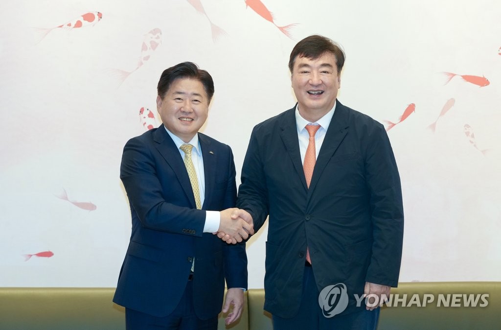 | ▲ 제주 찾은 싱하이밍 대사 (제주=연합뉴스) 박지호 기자 = 싱하이밍 주한중국대사(오른쪽)가 26일 오전 제주시 노형동 드림타워에서 열린 '한중 미래발전 제주국제교류주간' 개막식 전 오영훈 제주지사와 만나 악수하고 있다. 2023.7.26 jihopark@yna.co.kr |