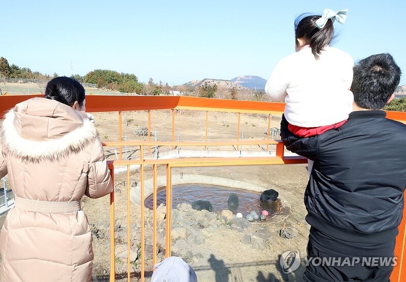 | ▲ 반달곰 보러 왔어요 (서귀포=연합뉴스) 백나용 기자 = 13일 오후 제주 서귀포시 성산읍 수산리 제주자연생태공원을 찾은 방문객이 최근 제주로 이주한 반달가슴곰을 관람하고 있다. 지난해 경기 용인 한 민간시설에서 제주로 이주한 반달가슴곰 4마리는 정착에 성공해 이날부터 도민과 관광객에 공개되고 있다. 2024.1.13 dragon.me@yna.co.kr |