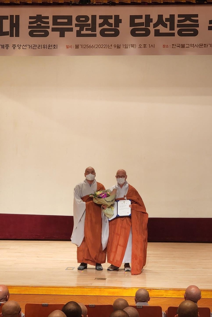 ▲ 차기 총무원장 당선증 받은 진우스님 (서울=연합뉴스) 양정우 기자 = 조계종 차기 총무원장 선거에서 당선된 진우스님(오른쪽)이 1일 종단 중앙선거관리위원회에서 당선증을 받고 중책을 맡게 된 소감을 밝혔다. 2022.9.1 eddie@yna.co.kr (끝)