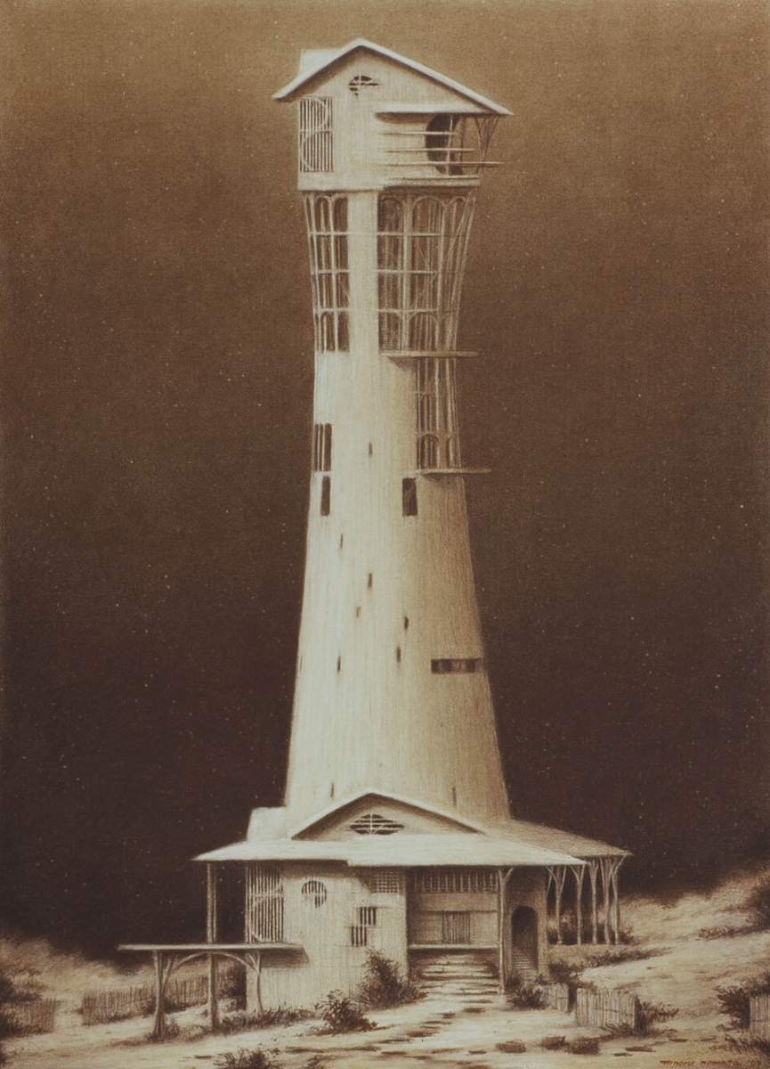 그의 작품에는 대부분 세로로 솟아오른 거대한 구조물들이 등장한다. 정교하게 묘사된 구조물들은 어디선가 본 듯도 하지만 모두 작가의 상상 속에서 만들어낸 것이다. 별다른 배경 없이 낮은 수평선만이 펼쳐진 허허벌판 위에 우뚝 솟아 있는 그림 속 건축물들은 환상적이면서도 한편으로는 뭔가 불안한 느낌을 주기도 한다.