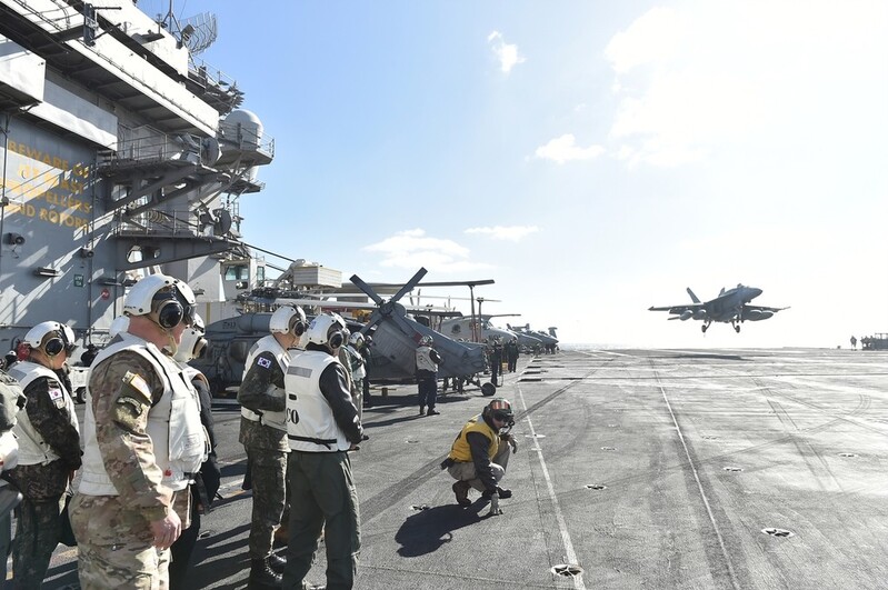 On the first day of the exercise, JCS Chairman Adm. Kim Myung-soo and Gen. Paul LaCamera, the commander of United States Forces Korea, visited the aircraft carrier.