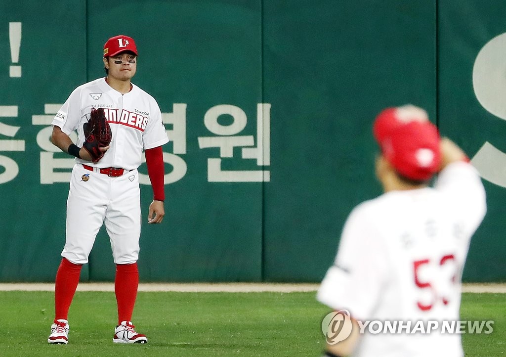 | ▲ Choo Shin-soo of the SSG Landers (L) stands in right field against the Hanwha Eagles in the top of the fifth inning of a Korea Baseball Organization regular season game at Incheon SSG Landers Field in Incheon, 40 kilometers west of Seoul, on April 7, 2021. (Yonhap) |