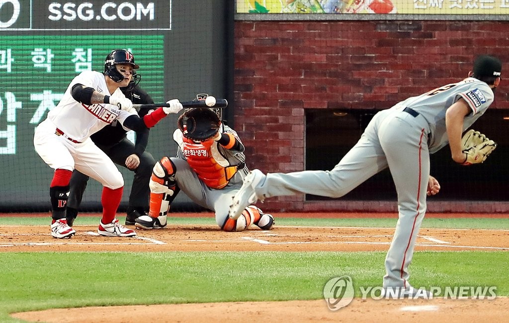 | ▲ Choo Shin-soo of the SSG Landers (L) attempts a bunt against Ryan Carpenter of the Hanwha Eagles in the bottom of the first inning of a Korea Baseball Organization regular season game at Incheon SSG Landers Field in Incheon, 40 kilometers west of Seoul, on April 6, 2021. (Yonhap) |