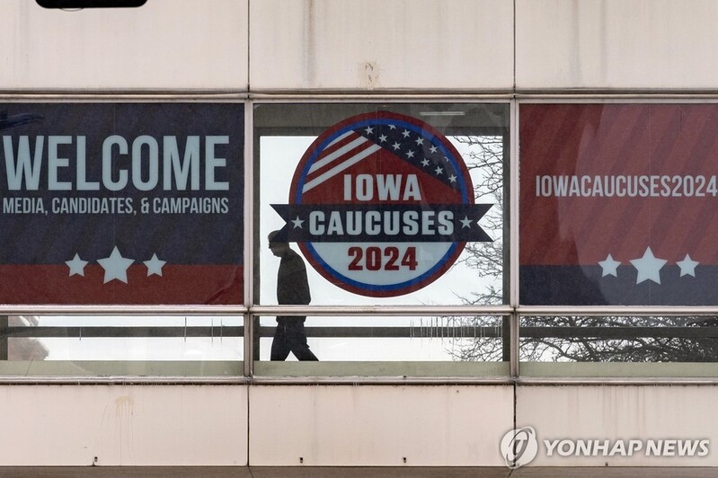 | ▲ This photo, released by the Associated Press, shows a man walking past a sign that reads "Iowa Caucuses 2024" in downtown Des Moines, Iowa on Jan. 13, 2024. (Yonhap) |
