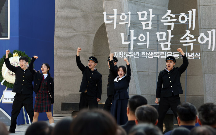 A performance commemorating the 95th anniversary of the student independence movement is held at the Student Independence Movement Memorial Tower in Gwangju, about 267 kilometers south of Seoul, on Nov. 3, 2024. The movement began on Nov. 3, 1929, in the city in protest of Japan's colonial rule of Korea and was attended by over 54,000 students from about 320 schools across the country until March 1930. (Yonhap)