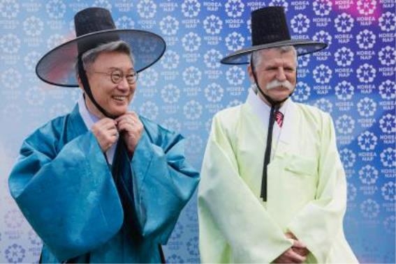 | ▲ 박철민 헝가리 대사(왼쪽)와 쾨비르 헝가리 국회의장이 한복을 입은 장면 [주헝가리 한국대사관·한국문화원 제공] |