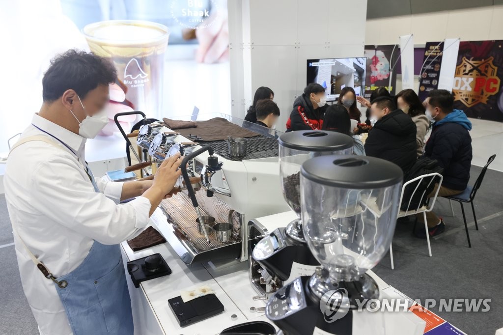 | ▲ 카페 창업 (서울=연합뉴스) 강민지 기자 = 5일 오전 서울 강남구 코엑스에서 열린 '제68회 프랜차이즈 창업박람회 2023'에서 한 카페 부스 관계자가 커피를 준비하고 있다. 2023.1.5 mjkang@yna.co.kr |