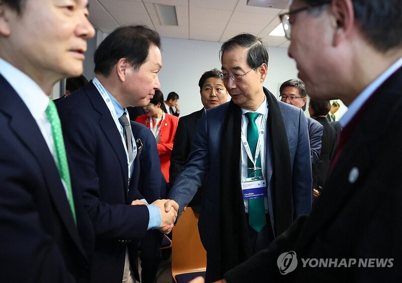 ▲ 부산, 2030 세계박람회 유치 아쉬운 실패 (파리=연합뉴스) 황광모 기자 = 한덕수 국무총리와 최태원 대한상의 회장이 28일 오후(현지시간) 프랑스 파리 외곽 팔레 데 콩그레에서 열린 제173차 국제박람회기구(BIE) 총회에서 2030년 세계박람회 개최지 투표 결과 부산이 탈락하자 아쉬워하며 서로 격려하고 있다 2023.11.29 hkmpooh@yna.co.kr