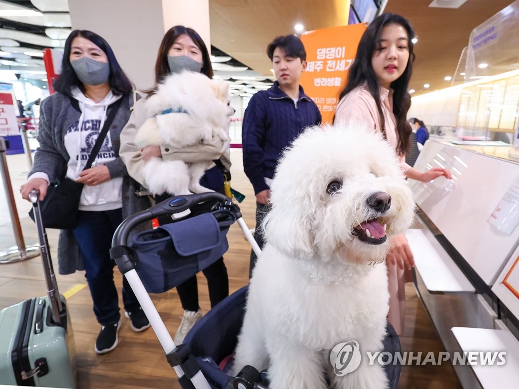 | ▲ 반려동물과 함께 제주로 '댕댕이 제주 전세기 상품 출시' (서울=연합뉴스) 김도훈 기자 = 제주도 반려동물 동반 전세기 여행 상품 운항을 시작한 16일 오전 서울 김포공항에서 탑승객이 강아지와 함께 탑승 수속을 밟고 있다. 반려동물 여행 플랫폼 '반려생활'은 김포와 제주를 왕복하는 2박3일 일정으로, 연말까지 월 1회씩 총 10회 운영하는 '댕댕이 제주 전세기' 상품을 출시하고 이날부터 운항을 시작했다. 2023.3.16 superdoo82@yna.co.kr |