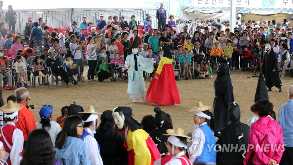 ▲ 관노가면극으로 시작한 강릉단오제 (강릉=연합뉴스) 유형재 기자 = 18일 천년 축제 강릉단오제가 개막한 가운데 강릉 남대천 단오장에서 관노가면극이 신명나게 펼쳐지고 있다. 2023.6.18 yoo21@yna.co.kr