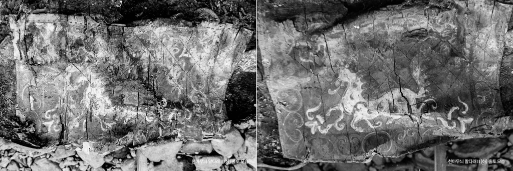 위쪽 그림은 상대적으로 훼손이 심한 편이라고 알려졌는데, 발굴 당시 다른 유물을 보존 처리하는 과정에서 약품이 흘러내리고 스며들면서 일부 손상되기도 했다.