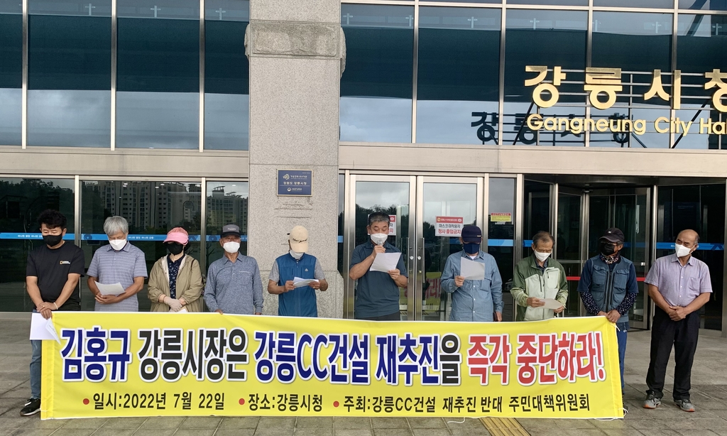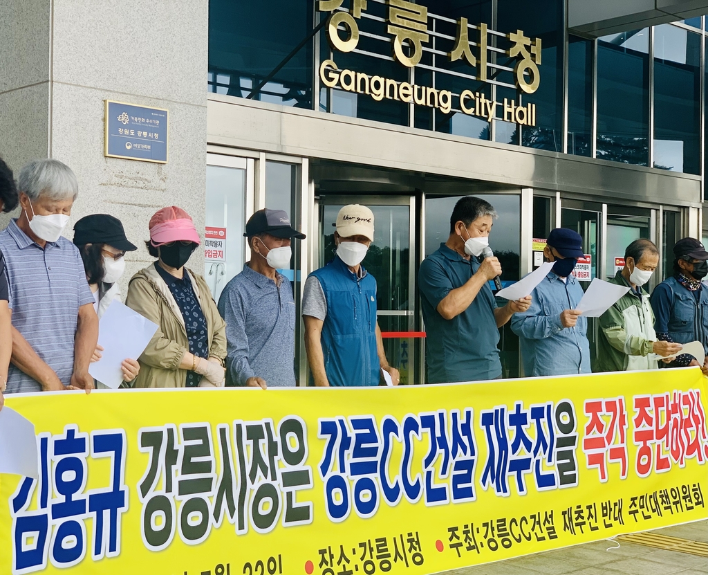 대책위는 이날 강릉시청 앞에서 기자회견을 하고 "최근 구정면에는 정체를 알 수 없는 '구정면 골프장 유치 건의 주민 서명부'가 돌기 시작했다"며 "이러한 행위는 강릉시 행정의 조직적 개입 없이는 진행될 수 없다"고 주장했다. 강릉시 구정면 일원에 66만㎡ 규모로 진행하던 강릉CC는 2007년 시작 단계부터 주민과 시민의 반대에 부딪혀 오랜 갈등을 겪은 후 골프장이 아닌 대안 사업을 추진하기로 합의하면서 2012년 8월 일단락됐다.