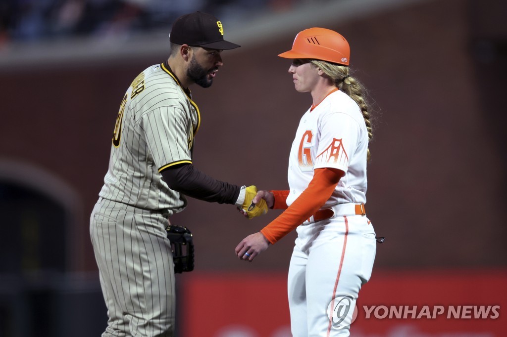 (서울=연합뉴스) 하남직 기자 = 얼리사 내킨(32) 샌프란시스코 자이언츠 코치가 여성 지도자 중 처음으로 미국프로야구 메이저리그(MLB) 경기 중 '그라운드'에 서는 새 역사를 썼다.