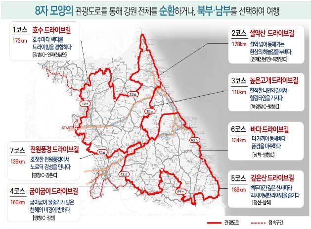 강원 관광도로는 도내 국도와 지방도 1천298㎞에 걸쳐 7개 코스, 8자 형 순환 루트로 구성돼 있다.