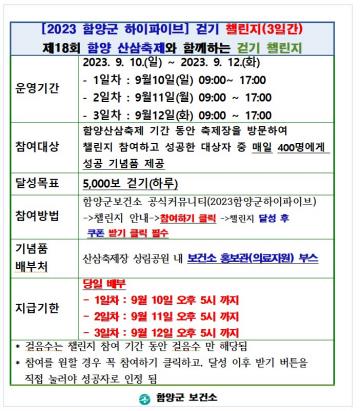 함양군보건소가 오는 10일부터 12일까지 3일 동안 하루 선착순 400명씩 1천200명을 대상으로 걷기 챌린지를 한다.