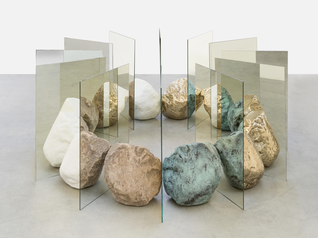 돌 3개를 나란히 놓은 작품에서는 가운데 돌이 실제 돌이고, 양쪽 돌은 청동 복제본이다. 돌 사이에 이번에도 양면 거울이 있다. 관람객 시점에 따라 보이는 돌들은 진짜일 수도, 아닐 수도 있다. 무엇을 보느냐에 따라 우리의 관점도 달라짐을 말하는 작업이다.