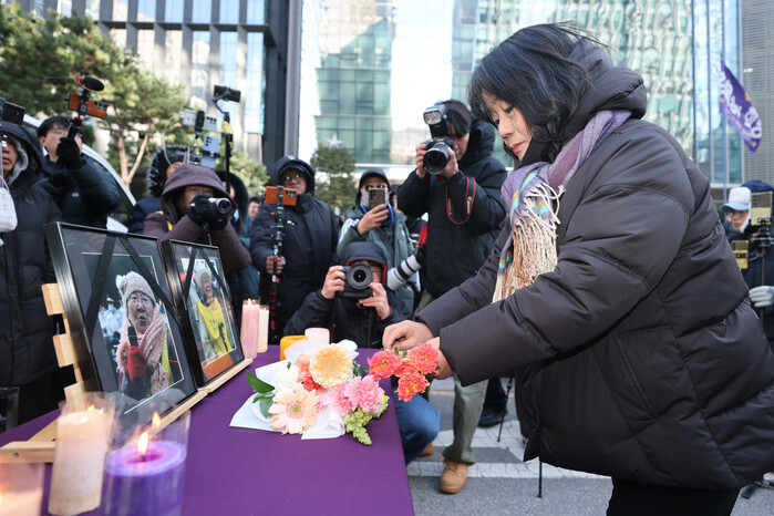 Former lawmaker Youn Mee-hyang places flowers at an altar for Gil Won-ok and Lee Ok-seon, victims of Japan's sexual enslavement who died in 2025, as protestors hold a regular Wednesday rally near the Japanese Embassy in Seoul on Dec. 31, 2025, to call for Japan's apology and compensation for the victims of the Japanese army's sexual slavery during World War II, euphemistically called "comfort women." (Yonhap)