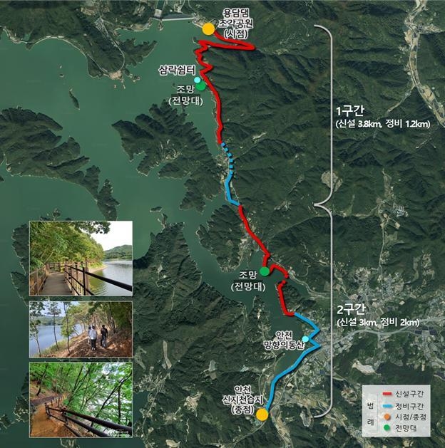 먼저 2024년까지 용담댐 조각공원에서 구실재까지 안내시설, 전망대, 쉼터를 조성하고 2025년에는 안천면 신지천습지까지 이르는 탐방로, 안내시설, 전망대 쉼터 등을 만들 예정이다.