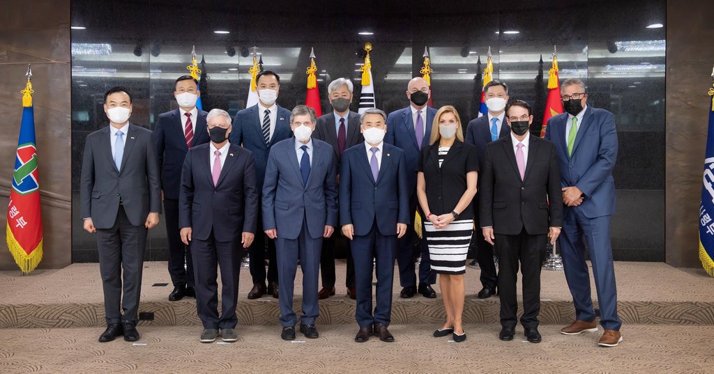 | ▲ South Korean Defense Minister Lee Jong-sup (C, front row) and a visiting group of U.S. experts and a congresswoman pose for a photo at the defense ministry in Seoul on Aug. 10, 2022, in this photo released by the ministry. (PHOTO NOT FOR SALE) (Yonhap) |