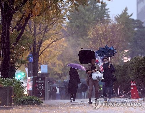 | ▲ Strong wind and rain engulf a street in central Seoul on Nov. 6, 2023. (Yonhap) |