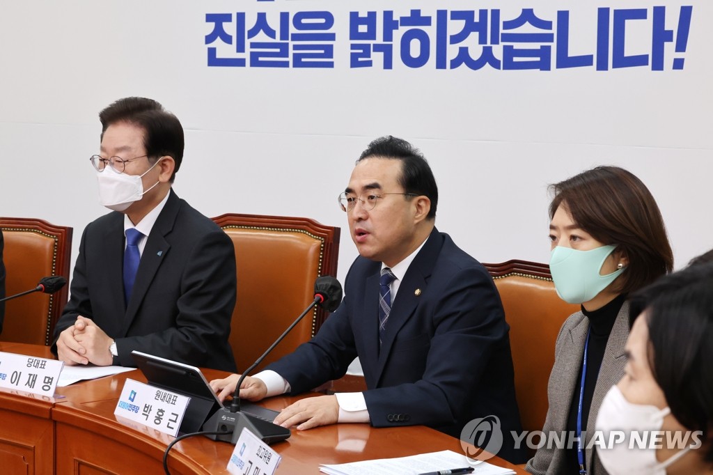 | ▲ Main opposition Democratic Party floor leader Park Hong-geun (C) speaks at a party meeting held at the National Assembly in Seoul on Dec. 5, 2022. (Yonhap) |