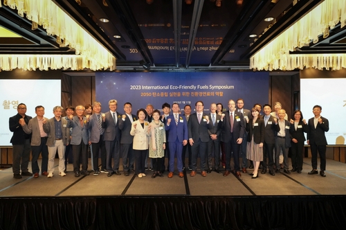 | ▲ This photo, taken July 11, 2023, and provided by the Korea Automobile Journalists Association, shows Mark Dries (9th from R), agricultural minister-counselor of the U.S. Embassy Seoul, and other experts who participated in the 2023 International Eco-Friendly Fuels Symposium held at Four Seasons Hotel at Gwanghwamun, central Seoul. (PHOTO NOT FOR SALE) (Yonhap) |