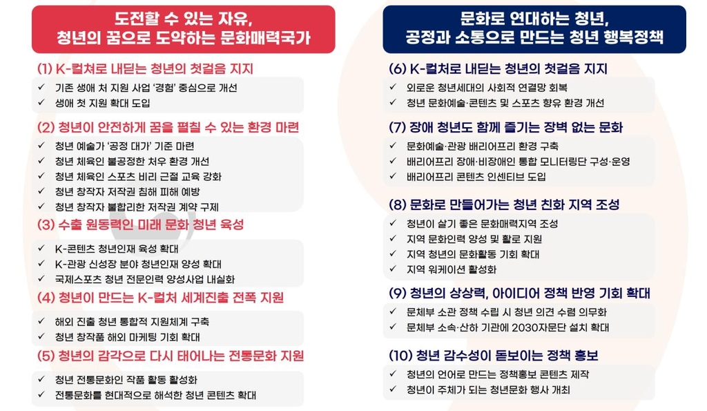 이날 10대 과제의 세부 과제로는 기존의 생애 첫 지원사업을 '경험' 중심으로 개선하고, 청년 예술가가 공연 준비에 투입한 노력 등을 보상하도록 하는 '공정 대가' 기준 수립, K-콘텐츠와 관광 신성장 분야 청년 인재 육성, 외로운 청년 세대의 사회적 연결망 회복, 문체부 소관 정책 수립 시 청년 의견 수렴 의무화 등이 제시됐다.