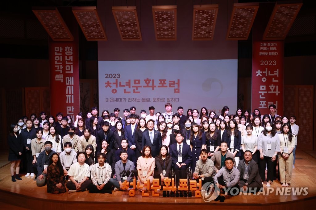 | ▲ '청년들의 메시지' 2023 청년문화포럼 (서울=연합뉴스) 진연수 기자 = 15일 서울 서초구 국립국악원에서 '2023 청년문화주간'의 일환으로 열린 청년문화포럼에서 박보균 문화체육관광부 장관과 문체부 2030자문단인 MZ드리머스, 청년인턴 등 참석자들이 기념촬영을 하고 있다. 2023.5.15 jin90@yna.co.kr |