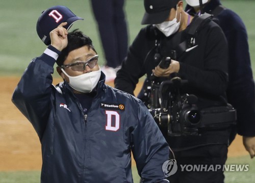 | ▲ 승장 김태형 감독 (서울=연합뉴스) 홍해인 기자 = 5일 오후 서울 잠실야구장에서 열린 2020 프로야구 포스트시즌 준플레이오프(준PO) 2차전 두산 베어스와 LG 트윈스의 경기에서 9-7로 승리하며 플레이오프에 진출한 두산 김태형 감독이 경기 종료 뒤 관중석을 향해 인사하고 있다. 2020.11.5 hihong@yna.co.kr |