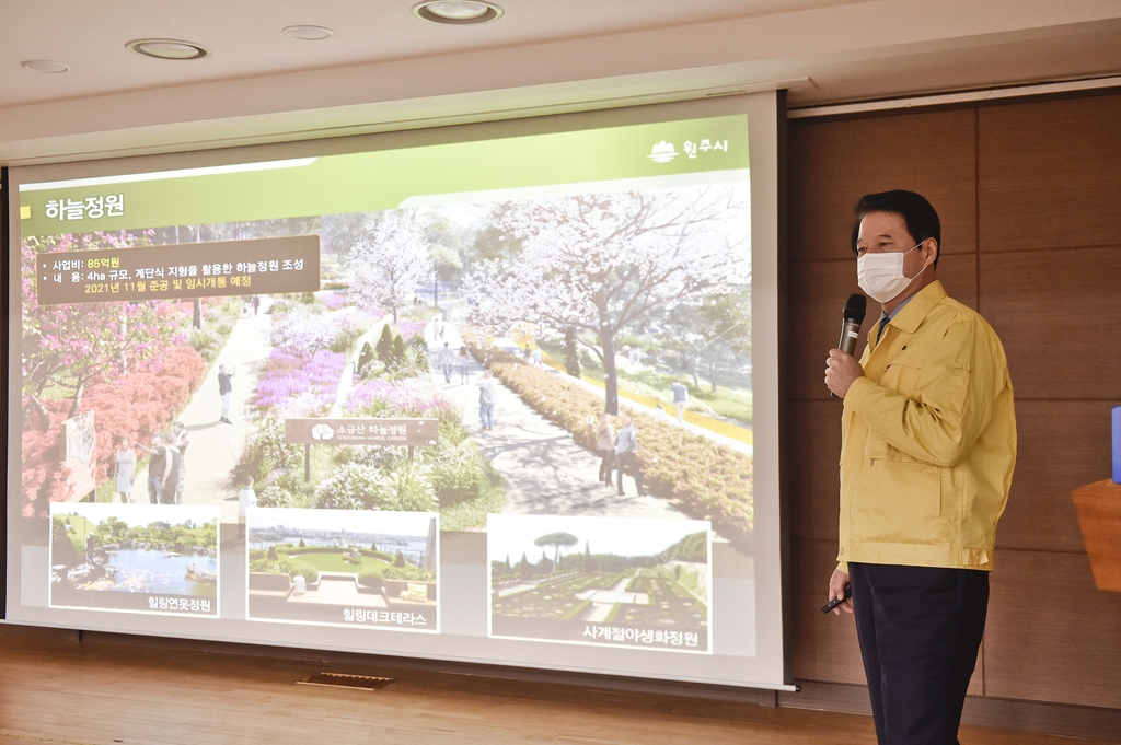 | ▲ 원주 간현관광지 종합 개발 (원주=연합뉴스) 김영인 기자 = 원창묵 원주시장이 3일 정례 브리핑에서 간현관광지 종합 관광개발 사업의 마지막 공정인 케이블카 설치 공사에 대해 설명하고 있다. 2021.3.3 |
