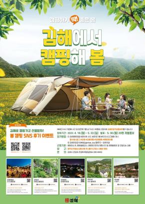 5개 캠핑장 중 1곳을 방문해 인스타그램에 사진, 방문 후기를 남긴 후 김해관광 공식 SNS(@gimhae_tour)를 팔로우하고 참여 댓글을 남기면 된다.
