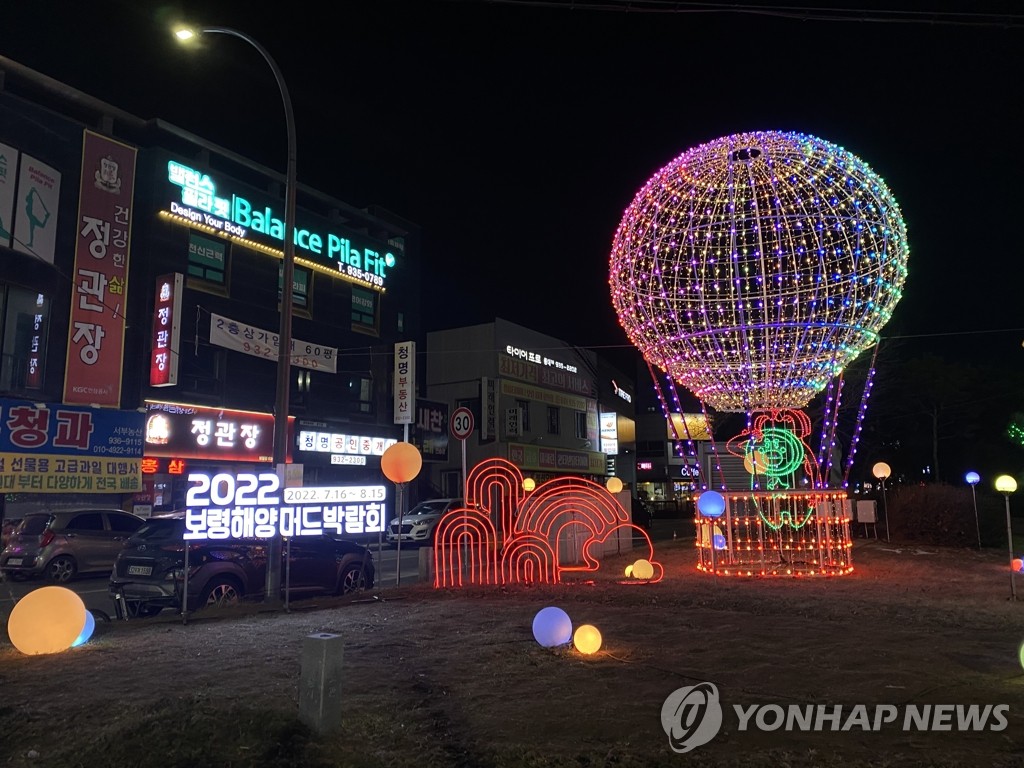 2022 보령 해양머드박람회 대표 캐릭터와 별, 열기구 등 모양의 경관 조명이 시각적 아름다움을 선사하고 있다. (글 = 정찬욱 기자, 사진 = 보령시 제공)