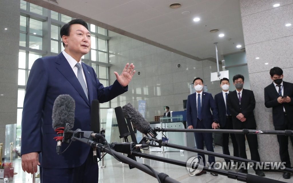 | ▲ President Yoon Suk-yeol takes reporters' questions as he arrives at his office in Seoul on June 24, 2022. (Pool photo) (Yonhap) |