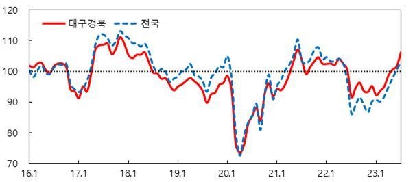 한은 대구경북본부 관계자는 "가계 재정 상황과 경제 상황에 대한 인식이 좋아지면서 소비자심리지수가 전월보다 4.7 포인트 상승했다"며 "전국(103.2)보다 높은 수준"이라고 밝혔다.