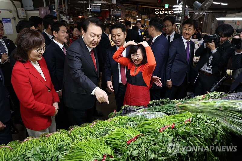 | ▲ President Yoon Suk Yeol (2nd from L) purchases water parsley at Chilseong Market in the southeastern city of Daegu on Nov. 7, 2023. (Yonhap) |