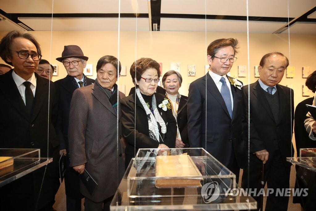 부인인 강인숙 영인문학관장은 "더는 컴퓨터를 쓸 수 없어 책상을 가져다 놓고 '눈물 한 방울'을 쓰던 모습이 생생하다. 그 당시 책상에 있던 메모지도 그대로"라며 한참 동안 책상을 바라봤다.