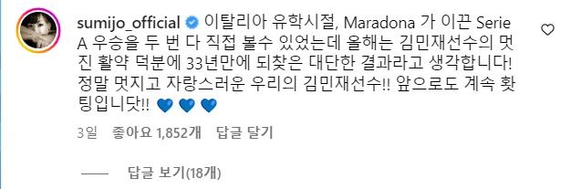 조수미는 지난 5일(한국시간) 나폴리의 세리에A 우승이 확정된 뒤 김민재가 자신의 인스타그램 계정에 올린 감사 인사글에 축하 댓글을 달았다.