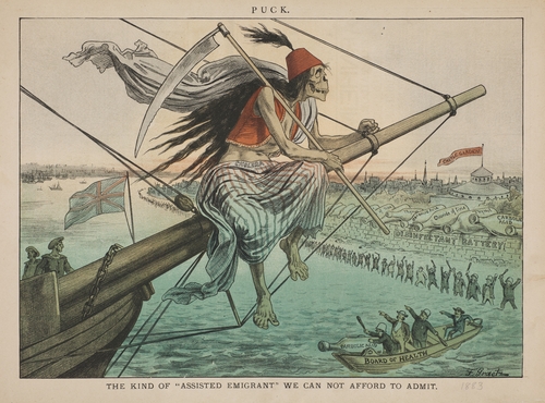 배의 앞부분에는 해골 같은 모습의 형체가 앉아 있는데 세계 최초의 소독약인 '석탄산'으로 무장한 사람들은 이 배가 들어오지 못하도록 막으려 한다. 외지에서 온 사람 즉, 이민자들에 의한 콜레라 유입과 공포감을 상징적으로 보여주는 그림이다.