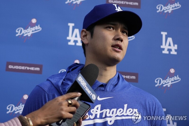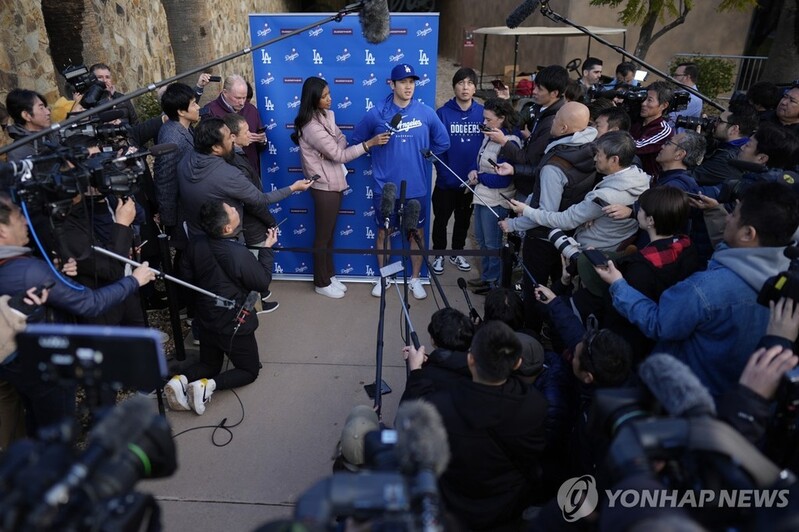 (서울=연합뉴스) 하남직 기자 = '현역 최고 야구 스타' 오타니 쇼헤이(29·로스앤젤레스 다저스)가 미국프로야구 다저스를 상징하는 파란색 훈련복을 입고, 수 많은 취재진 앞에 섰다.