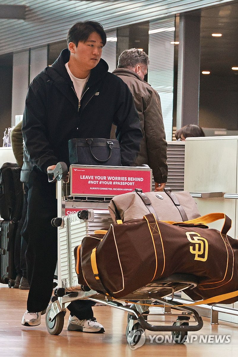 | ▲ 미국으로 향하는 고우석 (영종도=연합뉴스) 한종찬 기자 = 미국프로야구 메이저리그 샌디에이고 파드리스와 계약한 고우석이 9일 오후 스프링캠프에 참석하기 위해 미국으로 출국하고 있다. 2024.2.9 saba@yna.co.kr |